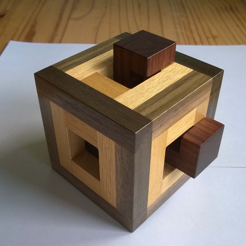 The Sonneveld Cubed Burr was designed by Dic Sonneveld around 1998/1999. This puzzle is very challenging to solve. At first glance it would seem that the 3 piece burr cannot be assembled inside the cube because of all the interference points between the pieces. However, these are overcome by a series twists and turns of each piece to maneuver them into their final positions. The cube is of blue mahoe and avodire, the three burr pieces, granadillo and is an exceptional piece of work by Tom Lensch.