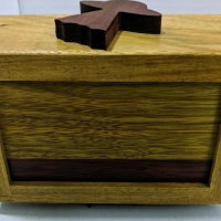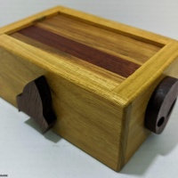 Made from Canarywood with Bloodwood accents on top and bottom panels, along with the side knobs, this puzzle looks amazing! It is themed after its name with the presence of alien head, space ship and a rocket on the sides.