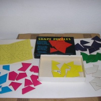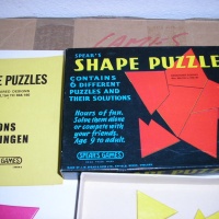 This is a set of 6 thick cardboard puzzles. They are all complete and in very good condition. The box lid is bent-in a little in a couple of places front and back, but is very solid and in generally good condition. This is a very nice set of cardboard geometric puzzles. Printed in England in 1970, Spear's Games number 2206.
