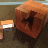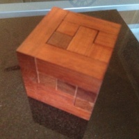This listing is for Tom Jolly's Spiral Cube 2, crafted by the Pelikan Workshop. This puzzle requires 10 moves for complete disassembly (1.5.4), including rotation or two