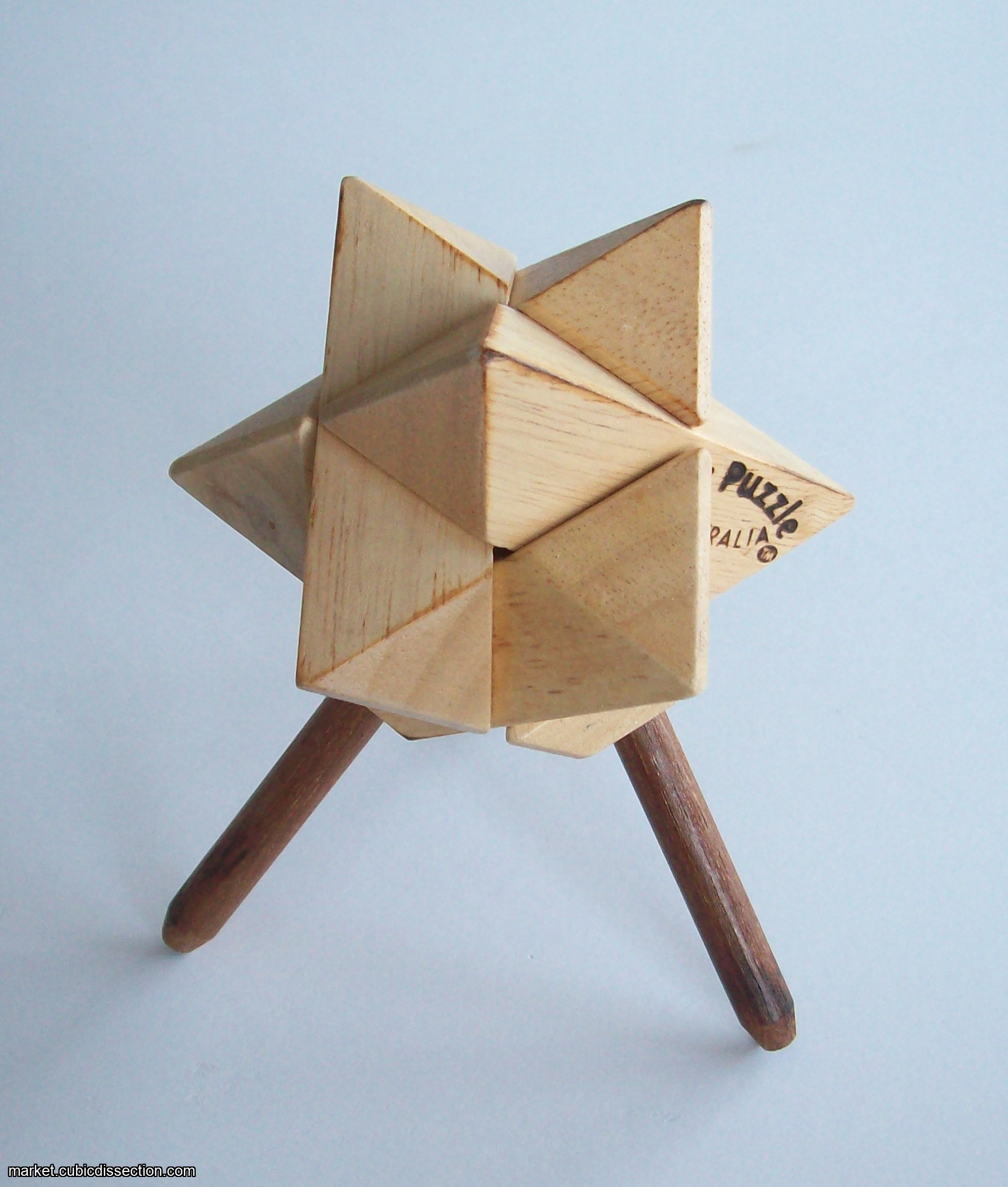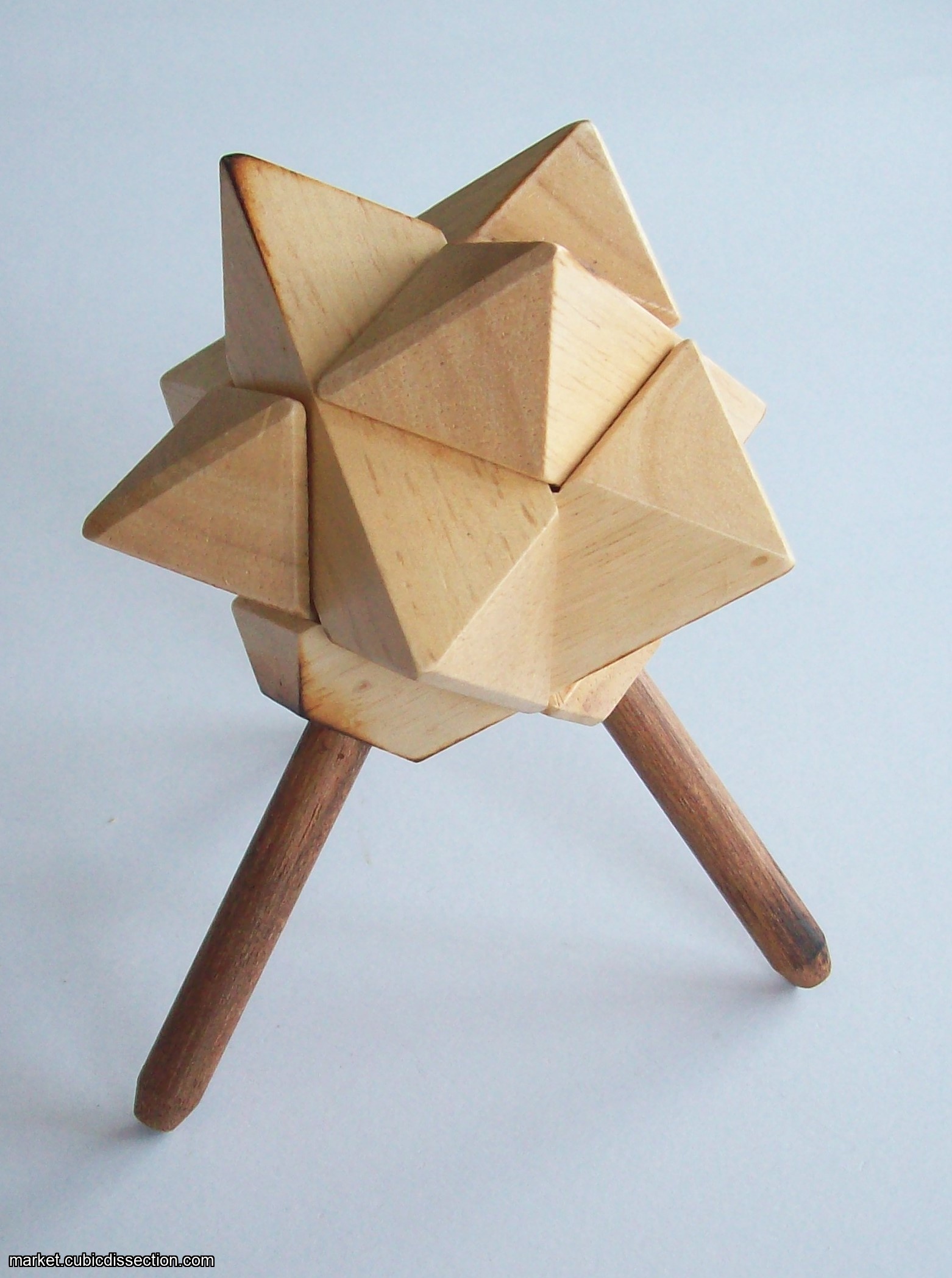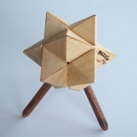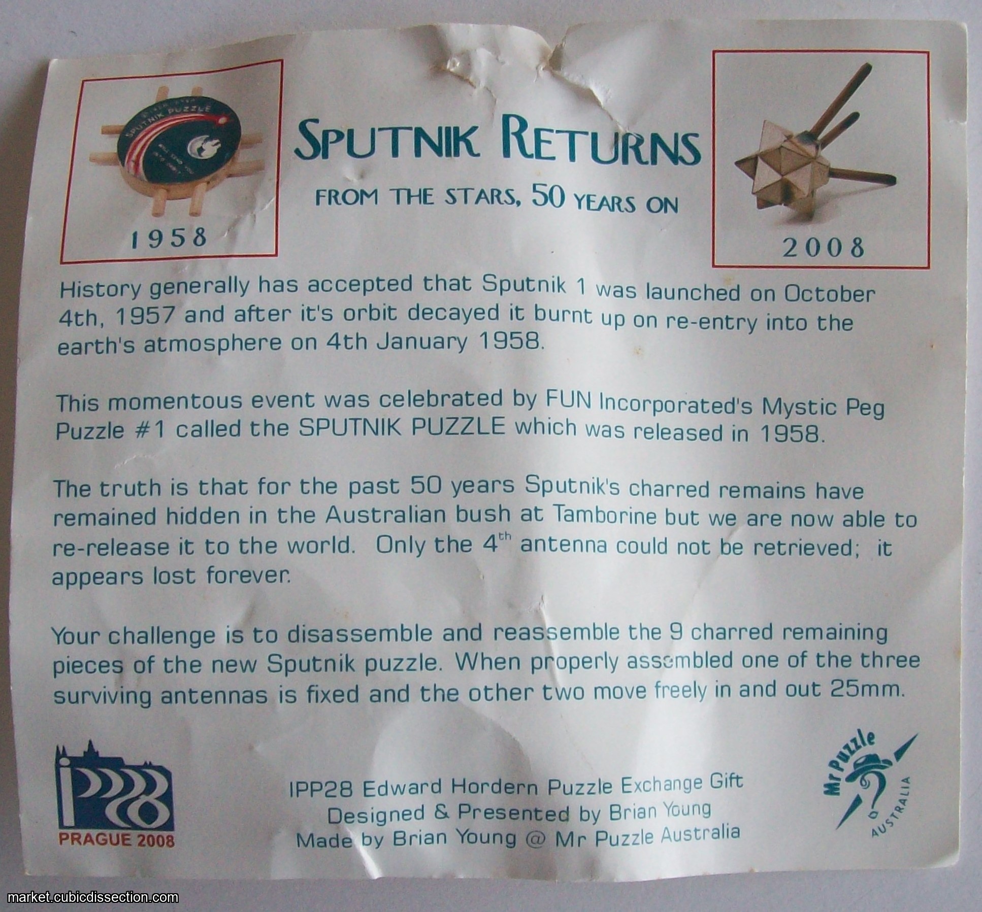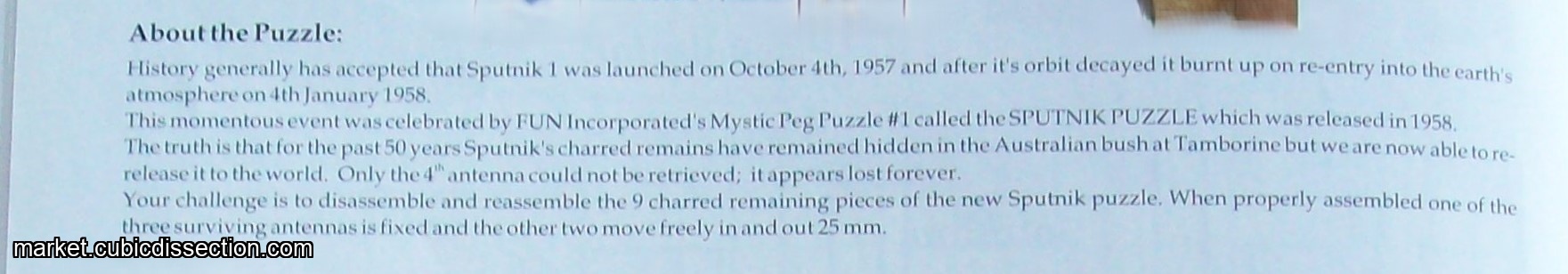 Your challenge is to disassemble and reassemble the 9 charred remaining pieces of the new Sputnik puzzle. When properly assembled one of the three surviving antennas is fixed and the other two move freely in out 25mm.