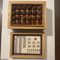 Allen Rolfs comprehensive and precisely manufactured exchange puzzle from IPP38 held in San Diego California in 2018. It provides all the pieces necessary (every notch combination on the sticks) to make every possible type of classic 6-piece puzzle star (stellated rhombic dodecahedron diagonal burr). All of the solutions are provided on the inside of the lid, but I will also provide a copy of the solution page from the IPP38 exchange book.