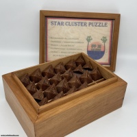 Star Cluster Puzzle was an exchange gift by Allan Rolfs for IPP 38 in San Diego. Included are 22 leopardwood sticks which combine in at least 53 different configurations to make the classic 'star burr' shape, the first stellation of the rhombic dodecahedron. Pieces are arranged by different possible notch patterns A through G. The storage container's lid has the different challenges written with each corresponding burr piece needed. Note, there are significant cosmetic defects present in both the box and the pieces such as knots and glue marks. Despite this each piece functions very nicely. Two sections from the internal storage space are purposely empty.