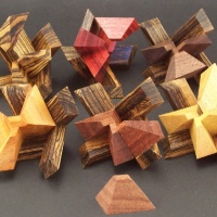 This is the infamous Two Tiers puzzle. This design has been sitting on the shelf for many years but was never made by Mr Coffin (or anyone else that I am aware of). Mr Coffin devoted an entire chapter in his PWPD book about it. Therefore, this is a one of a kind item. I understand why it was never made, as it is a tremendous pain in the expletive to make. I will not try it again anytime soon, so please don't ask. Essentially this is a two tiered garnet with the interior a standard garnet (#60) and the exterior where each piece is the same. The exterior pieces run in the opposite direction to the interior pieces, making for really unusual looking pieces. On top of all of that, the design calls for one of the interior garnet pieces to be left unglued. In this manner, the puzzle can be assembled in both of the published solutions. This means the puzzle has to be very accurately made, which it is.