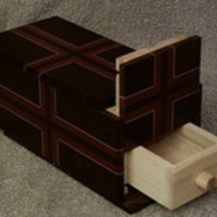 The box contains a single hidden drawer that can only be accessed by moving its panels in the proper order. The unique 3-toggle system used for its panel locks were gleaned from an ancient calculating machine I once saw on the history channel. (I am happy to send pics of the inside to anyone who desires them – because the internal mechanics really is astounding and it will not really give away much of the solution.) The result is a very challenging puzzlebox that can be solved through logic, but with constantly changing solution patterns.