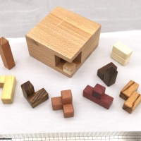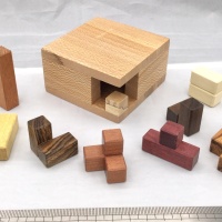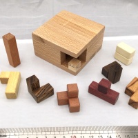 Straight4ward (designed by Laszlo Molnar)  ships unassembled Laszlo’s been at it again! Another very challenging packing puzzle from,in my opinion, one of the best at designing them! After production on these was almost complete, another solution was discovered with a rotation, however I felt that even with this added solution, this was an extremely difficult puzzle. The restricted opening alone, provides enough of a challenge for me! Try first to find the one solution without a rotation, then test yourself to find the rotation.  Lacquer and wax finish. 3” x 3” x 1.625” (7.6cm x 7.6cm x 4.1cm)        Spalted Sycamore box (minimal spalting but more pronounce grain)with Mixed Exotics pieces. (made from multi-unit pieces)
