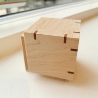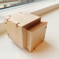 Strap is (in my mind) an interesting successor to Alkema's Clamp puzzle. The two pieces are filled by four cubes which can manuever internally. The solution is tricky and non-intuitive...all pieces are accessable so there is no need for gravity shifting. There is a rotation shortcut which is quite apparent with disassembly but not at all apparent during assembly, which is nice in my book...almost like two different puzzles. Strap is a lot of fun, and beautifully made with triple miters reinforced by splines.