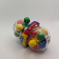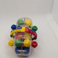 "The Super Brain Spinner is a puzzle consisting of four coloured wheels, each with 5 balls of a matching colour. One half has the blue and the green wheel on the same axis, but which can rotate independently by turning the knobs on the outside of the transparent casing. The other half is similar, and has a yellow and a red wheel on one axis. The two halves of the puzzle can be twisted relative to each other until the two axes are parallel, and the four wheels lie in two parallel planes. When you then turn any wheel, all 10 balls in the two wheels in that plane move around in a loop. It therefore has two loops of ten balls. By turning over one half of the puzzle, you switch two wheels between loops, mixing them up. You can also twist one half of the puzzle a quarter turn, and in this configuration all 20 balls form a single long loop, and turning any wheel causes all the wheels to move."