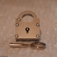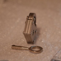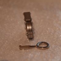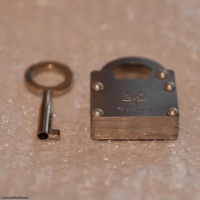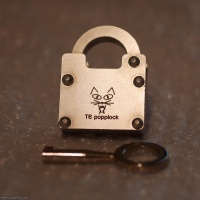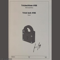 The sweetest Popplock Rainer Popp has ever made. A small stainless steel lock with aluminium rivets. In principle, it only has one trick, but it's really hard to find! It weighs a cute 110 grams and is 5 cm high. It is in really good condition, it has never been played and has only a few, very small visible scratches. There is a very small mini-scratch on the edge next to the middle right rivet on the back.