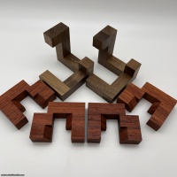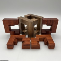 Taco Cube is a tricky and fun assembly. This interlocking puzzle is made from two identical frame parts combined with two sets of identical pieces. While not overly difficult, the solution is exciting and satisfying.