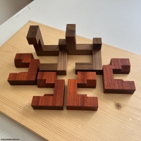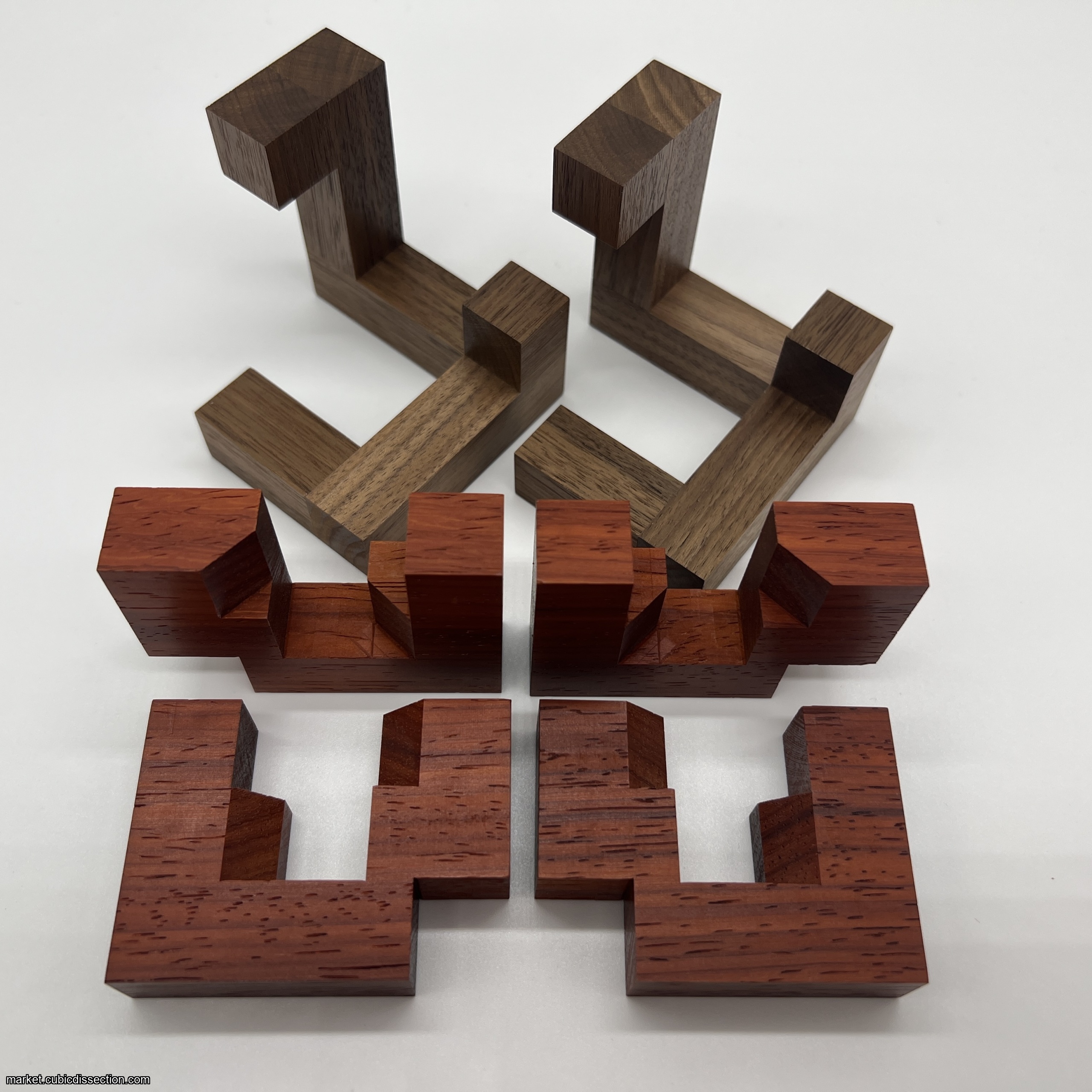 Taco Cube is a tricky and fun assembly. This interlocking puzzle is made from two identical frame parts combined with two sets of identical pieces. While not overly difficult, the solution is exciting and satisfying.