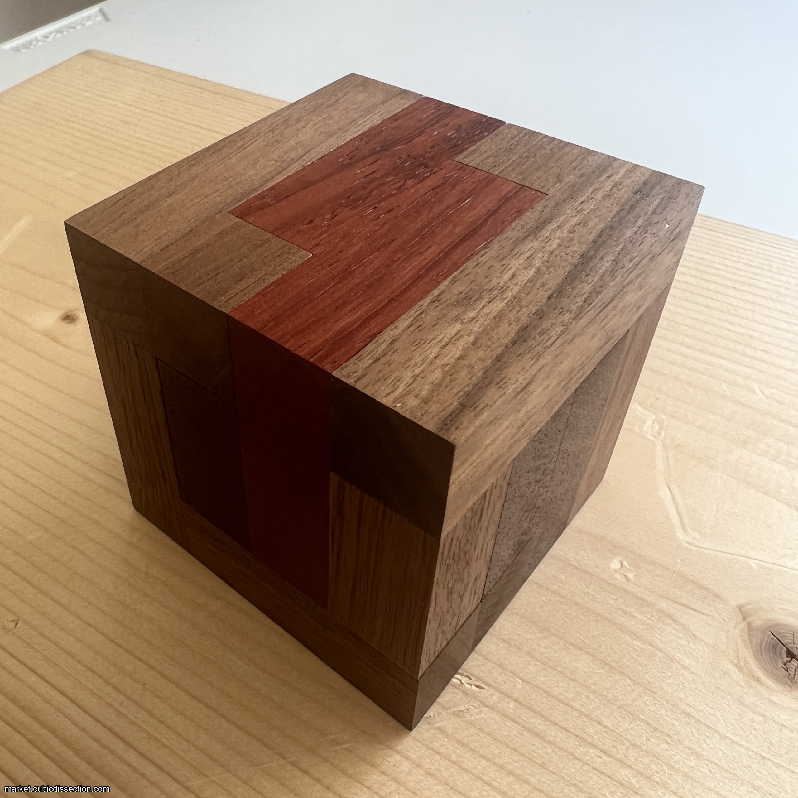 This batch of Taco Cube was constructed from Walnut and Padauk. Taco Cube ships in an unsolved configuration.