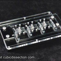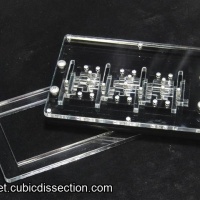 Precision cut from solid cast acrylic and painstakingly hand assembled, this puzzle has a nice weight/feel, and will not be confused with cheaper mass produced take apart items. The construction uses contrasting press fit dowel pins to align the internals, and the push pins are stainless so they do not corrode over time.