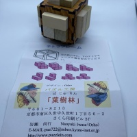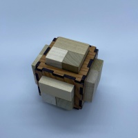 Tetra Frame by Osho. It comes in the solved state (ships this way when purchased new). It comes right apart and then the puzzle is to assemble it. There are is a discoloration on one of the wood pieces as seen in the photos. Also on a few others there is slight fading where the pieces sit in the frame or exposed to the light. For me it did not effect the solve because I did not pay attention, but the fading is there so I mention it.