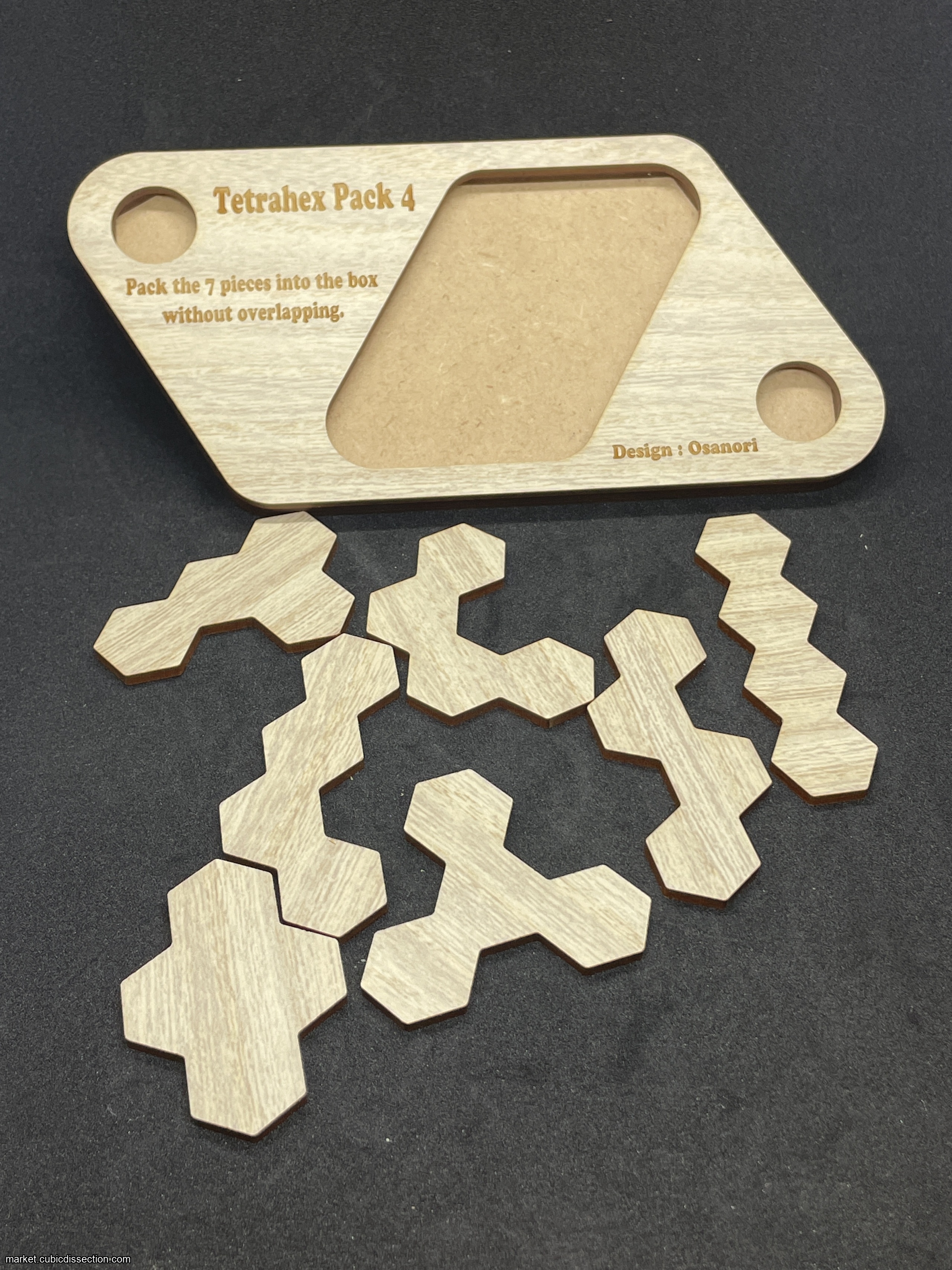 Tetrahex Pack 4 by Osanori Yamamoto. Restricted tray packing puzzle.