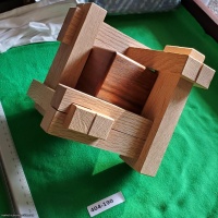 Objective is to take apart the Oak 12-piece burr which forms a cage around a Walnut cube, then open the puzzle box and locate the secret compartment with the artist's hanko.  Finishing and movement are excellent.  Includes original box labeled "K-12  #14".
