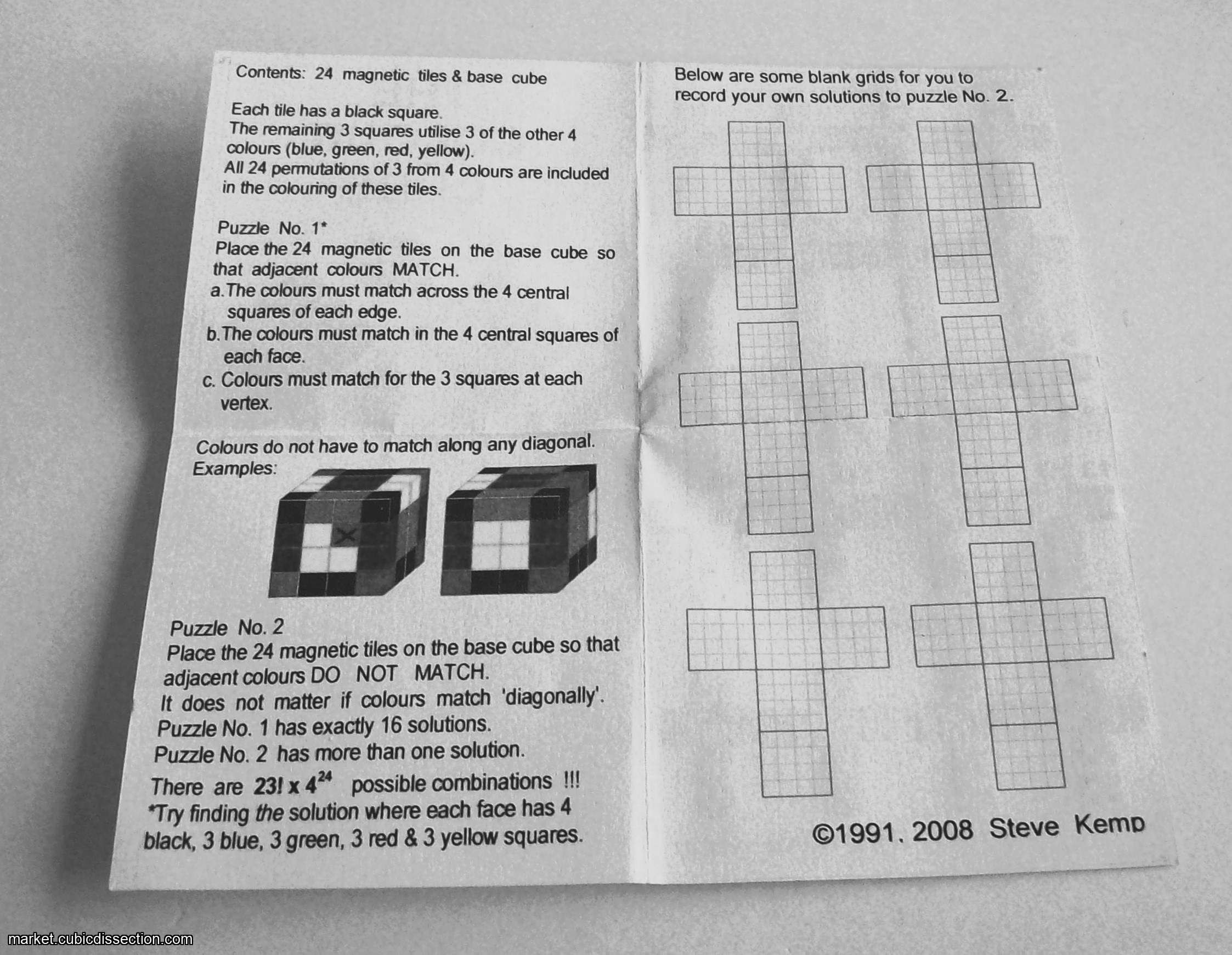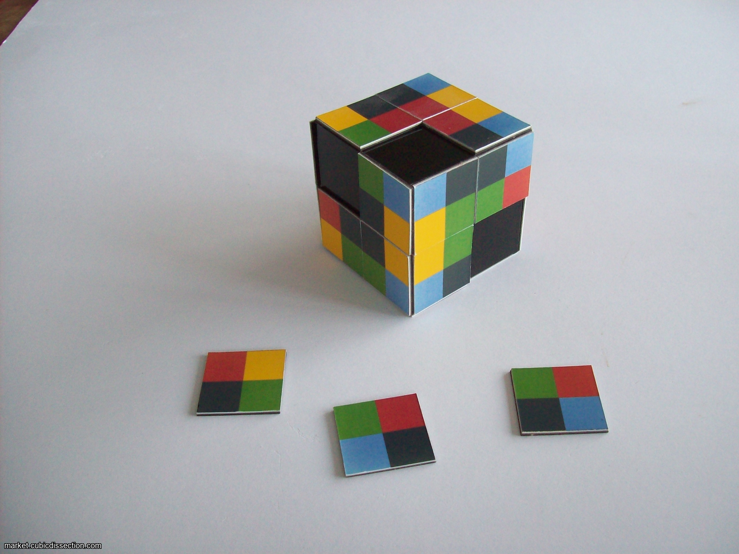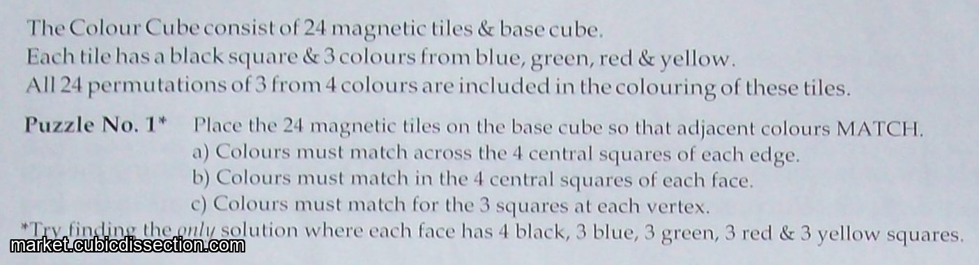 Place the 24 magnetic tiles on the base cube so that adjacent colour DO NOT MATCH edgewise. It does not matter if colours match ‘diagonally’.