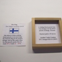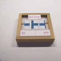 The object of this sliding block puzzle is to rearrange the Finnish flag to its proper design, and at the same time for the puzzle party line to read IPP 25 (not 25      IPP).