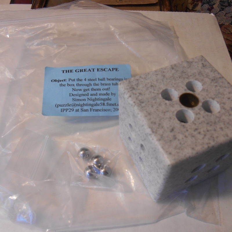 The Great Escape, by Simon Nightingale. This was an exchange puzzle from IPP29, made out of corian. Put 4 balls in, then try to get them out again. Weighs 12 oz with packaging, so shipping outside the US is $22.50 (for 9oz to 2 lb).