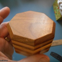 Octagon Box by Akio Kamei (also names "Pile of Disks"), Bits and Pieces #08-G7330. This one required a repair before I could solve it: there's a small plate inside that was manufactured with very soft wood, and a metal pin fell against it and wore a channel in it (before I owned it, of course!). This made the cover fall off with no effort. I replaced the wooden plate with a much harder wood and the puzzle appears to work fine now. The original Kamei version (not Bits and Pieces) appears to use a thicker wooden plate. See photo (the photo will not help you solve this).