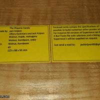 Jack Krijnen composed and made this burr set and named it the Phoenix Family. The set allows for the assemblage of Supernova, Excelsior, Barones, Burrly Sane for Extreme Puzzlers and Tiros, as well as several unnamed high level standard 18-piece burrs. All these burrs share comparable solutions, and have in Phoenix, designed by Alfons Eyckmans in 2008, a starting point for further explorations by Alfons and Jack. Hence the name of the set. The numbering of the pieces is deliberately chosen in such a way that the differences between the distinct burrs are easily recognized.