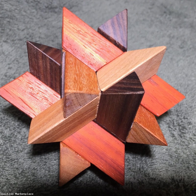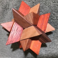 Six piece typical diagonal burr creating a beautiful shape. Well known Stewart Coffin design with four solutions giving colour symmetry.