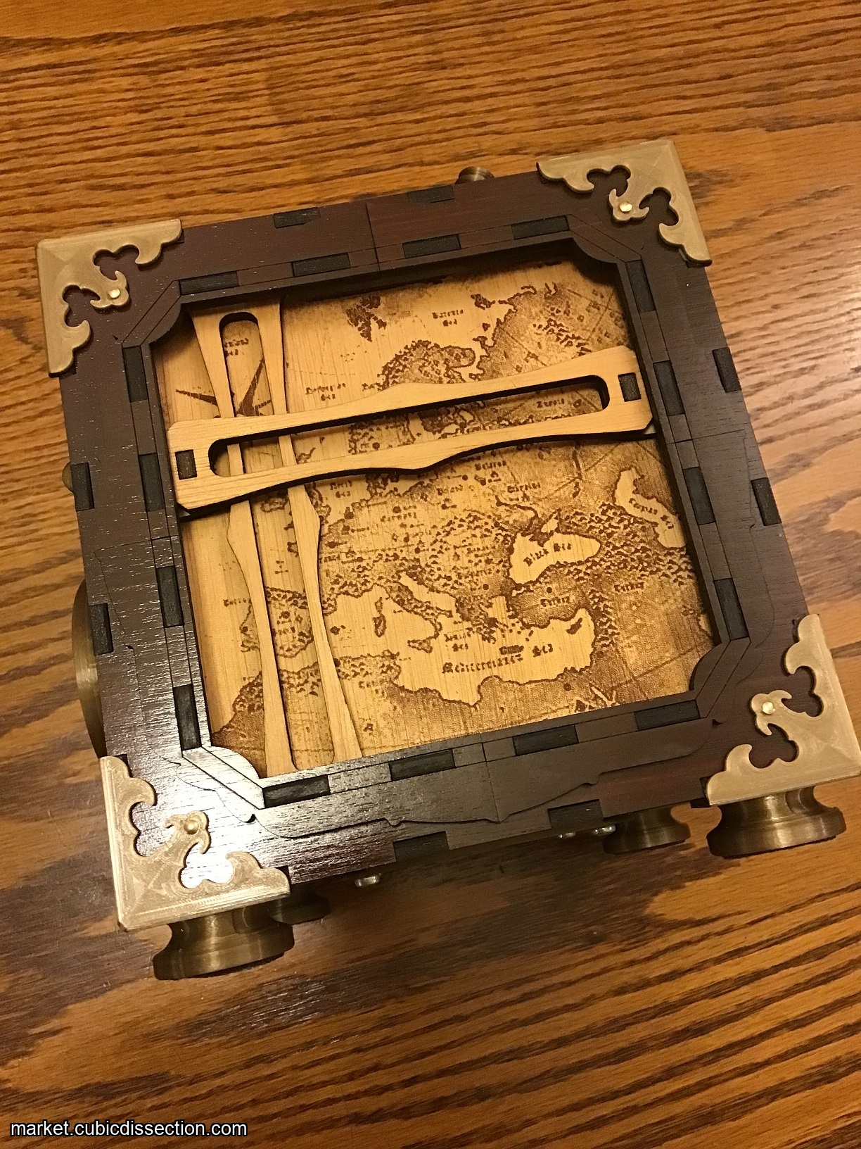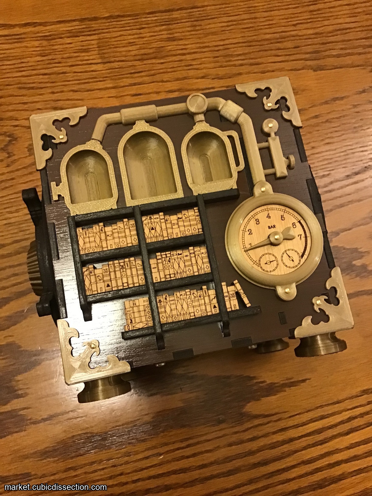 "Time Traveler’s Artifact is a sequential discovery puzzle box that takes you on a puzzle journey through the barriers of past, present and future. The development of this puzzle has taken nearly two years of designing, building, testing and iterating. The end result is a unique puzzle experience full of surprises, packed inside a mesmerizing machine that stands as an artifact worthy of any display! Time Traveler’s Artifact is the first puzzle that I am releasing to the public.