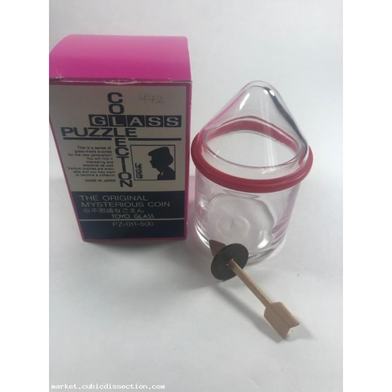Toyo Glass The Mysterious Coin w/ Box - How did the wooden arrow get through the coin? Nice condition - box has some writing on it.