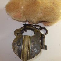 This is one of a series of locks I am selling. Mostly (all?) Indian manufacture and best described as "rustic". All should be working but several not tested for a few years and some solutions longs since forgotten. None are particularly tricky. Condition is far from great on most of these. Oil, Grease, Rust all present in varying degrees on these locks. If you have ever bought locks from India (as I did) you should know the kind of thing you are getting. A puzzle you may have to wash your hands or your Standardised Puzzle Hamster's fur after using,.