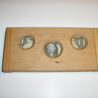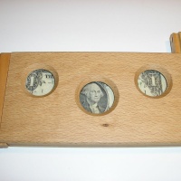Don't know the actual name of this. It's nicely made with dovetail sliding panels at both ends and has hidden magnetic pins. Once the end panel is off, the dollar bill can come out. About 8x4x0.75", solid woods.