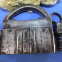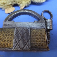 This is one of a series of locks I am selling. Mostly (all?) Indian manufacture and best described as "rustic". All are in working condition,  none are particularly tricky. Condition is variable on most of these. Oil, Grease, Rust all present in varying degrees on these locks.  If you have ever bought locks from India (as I did) you should know the kind of thing you are getting. A puzzle you have to wash your hands, or your Standardised Puzzle Hamster's fur after using,.