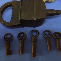 This is one of a series of locks I am selling. Mostly (all?) Indian manufacture and best described as "rustic". All are in working condition, none are particularly tricky. Condition is variable on most of these. Oil, Grease, Rust all present in varying degrees on these locks. If you have ever bought locks from India (as I did) you should know the kind of thing you are getting. A puzzle you have to wash your hands, or your Standardised Puzzle Hamster's fur after using,.