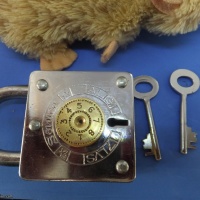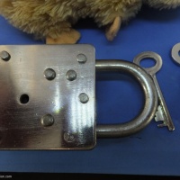 This is one of a series of locks I am selling. Mostly (all?) Indian manufacture and best described as "rustic". All are in working condition,  none are particularly tricky. Condition is variable on most of these. Oil, Grease, Rust all present in varying degrees on these locks.  If you have ever bought locks from India (as I did) you should know the kind of thing you are getting. A puzzle you have to wash your hands, or your Standardised Puzzle Hamster's fur after using,.