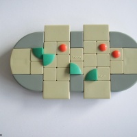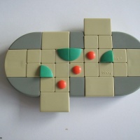 These have 18 tiles, which are moved by various sliding elements. The main element consists of a 2x7 rectangle and can be moved one tile to the left or to the right. There are 3 positions: left, right and center. The two small elements each consist of a rectangle of 3x2 tiles, 4 of which are common to the main area. These elements are connected in such a way that if one is pushed up, the other is pushed down and vice versa