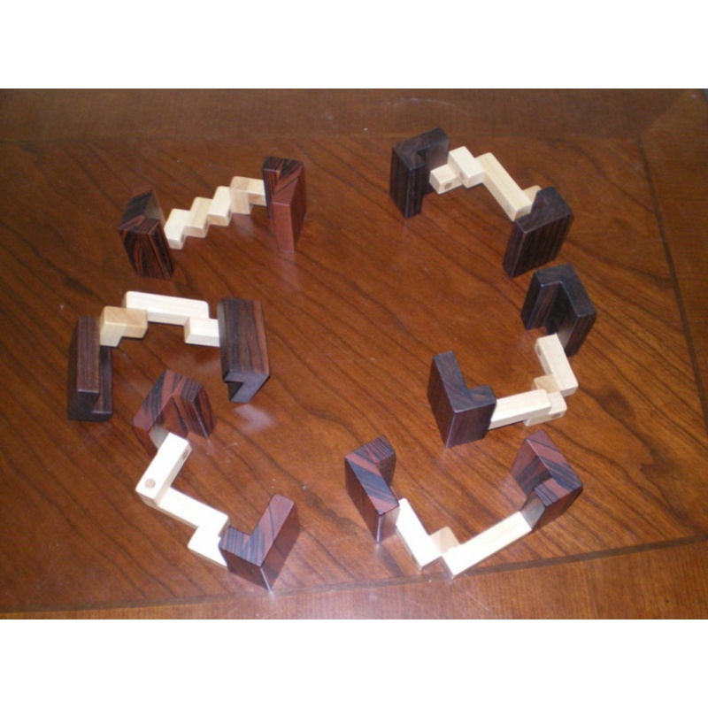 The Triple Crossed Burr looks great assembled. Unfortunately, this is the unassembled version. Despite Tom Lensch being ever gracious in sending me a duplicate copy of the paper assembly solution sequence, and my multiple inept attempts, I've been unable to reassemble the puzzle. A very nice display piece upon completion. Winning bidder to please e-mail for correct paypal address. Thank you.