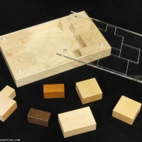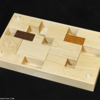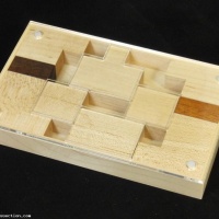 | COMMENTS: | I don't normally make flat puzzles, but this one by Jerry intrigued me. The goal is to switch the darker end pieces from one side to the other. Simple, right? How about no, Scott. If you do it perfectly it's 89 moves to exchange them. Good luck! Construction of this puzzle is quite nice, with mitered corners and a groovy acrylic top that shows the starting position of the pieces. Fit is, well, flat. Plenty of room to move the pieces inside, this puzzle should have no problems in high humidity environments. |