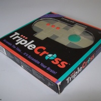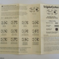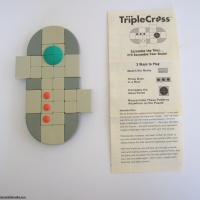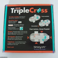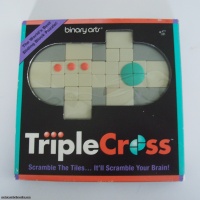 Triple Cross is a difficult puzzle because there are different tiles in the game. Four tiles in a 2x2 square have one large circle. There are also three identical tiles with a dot on them, which must come together in any order to form a 1x3 rectangle. The starting position has the circle on the far right and the dots on the upper left, the left plunger is depressed, and the bottom two tiles contain the “binary arts” logo. The goal is to restore these parts after the puzzle has been shuffled.