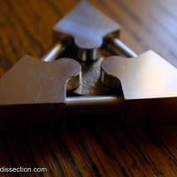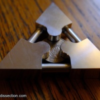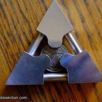 This was an IPP32 puzzle/impossible object. Object is to free the coin. Corner pieces and rods are aluminum, coin is a 1 Yen coin. This is currently unavailable new, I believe.
