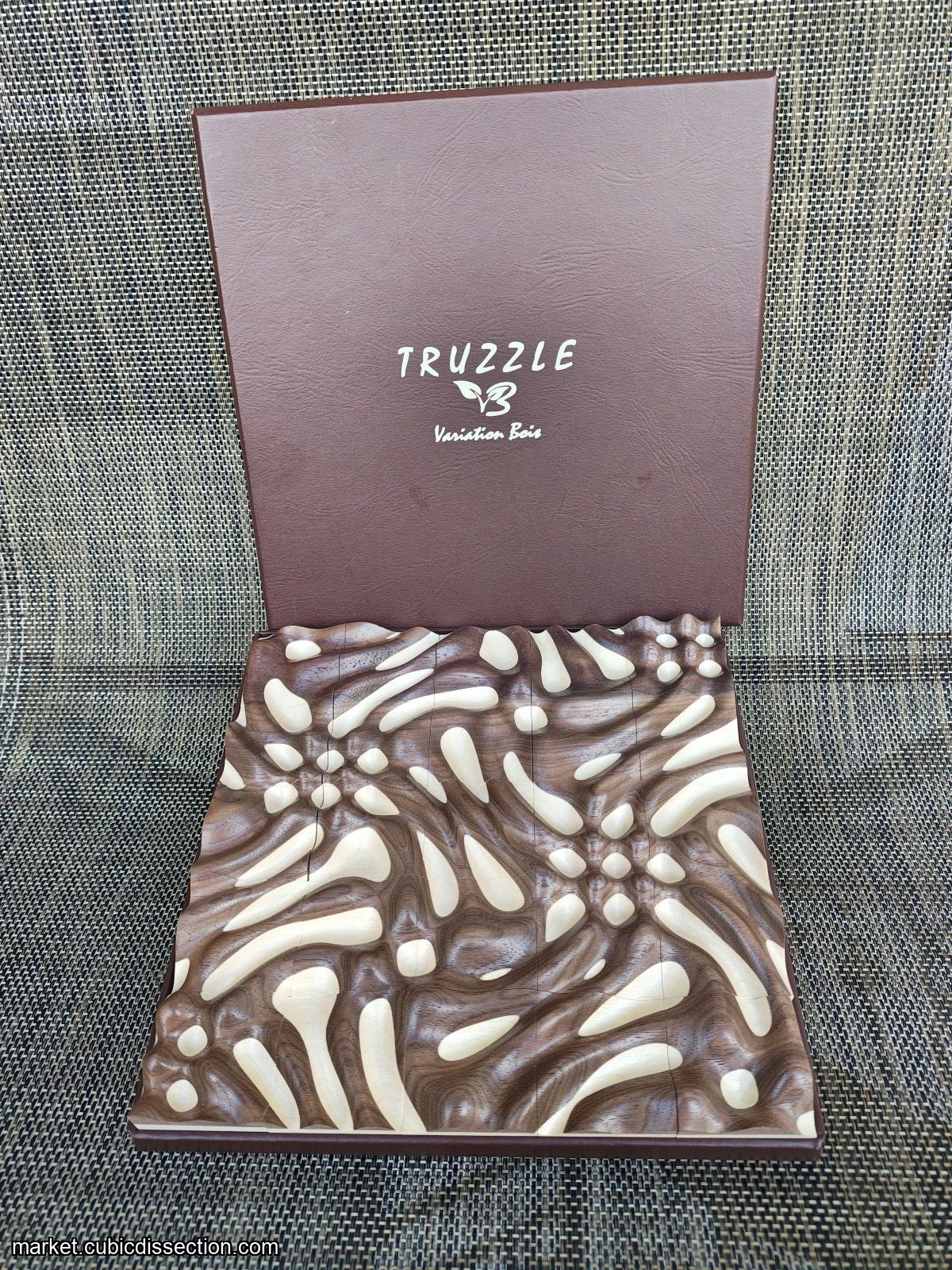 Crafted with a special technique using custom tools designed by the inventor Frank Paris, Truzzles are more difficult than the average jigsaw puzzles and more elegant than most traditional packing puzzles. Some of the patterns evoke swirls of silk while others are reminiscent of ripples on a pond.