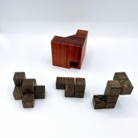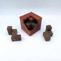 Osanori apparent cube packing puzzle crafted in beautiful exotic woods by Pelikan. Includes original box.