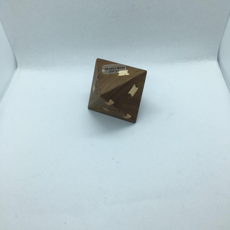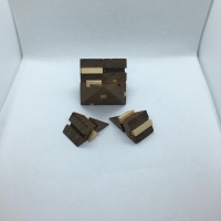 Twelve Bow Ties 3 was both designed and crafted by the master himself, Wayne Daniels, whose work is getting mighty hard to find these days. It was an IPP36 Exchange Gift from Marti Reis and is being sold as received - without having ever been disassembled except what little was done for one of the photos. There are 8 pieces, each with notches and dovetail-like protrusions that fit into the notches. This is an assembly puzzle, so taking it apart is easy. You won't need to do much to be confused about how it goes together afterwards - I found it confusing to reassemble just the two pieces that I removed for the photo. The puzzle is relatively small, which makes the smooth, easy sliding of its pieces all the more impressive.