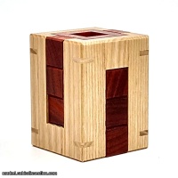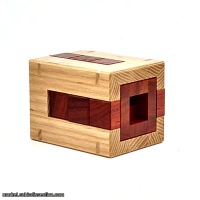 An exciting idea by Alfons, the Two Face Three puzzle combines six standard burr pieces with an unusual cage. The outer cage contains an inner shuttle cage that articulates independently. Very unusual movement and a difficult level 20 solution make this a must have for anyone interested in unique burr puzzles. Construction of this puzzle is outstanding, with a lot of detail work involved. The outer shell uses same species slipfeathers for looks and strength. The inside shuttle and burr pieces are precisely made, giving it an excellent fit that's a lot of fun to play with. Very unique once solved. This puzzle is shipped assembled.