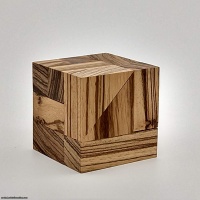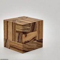 This simple cube is easy to solve, but I found the design interesting. Three different pieces use coordinate motion, sliding together neatly. Zebrawood was used for it's similarity between end and sidegrain...just looks nicer overall.