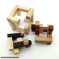 It's no secret that I love cube puzzles, and Andrey's "Repair the Cube" is an excellent one! Two internal pieces dance around the constraints of a truncated cage...the name asks you to position those pieces in such a way that they are contained within the cube and also repair the missing corner bits. With a level 11.10 solution, this is no easy task. onstruction of this puzzle was trickier than a 4x4 cube...this 5x5 has many more pieces and levels of interlock. Originally constructed using Wenge and White Oak. This unique version features an Ash cage with mixed wood internal pieces consisting of zebrawood, yellowheart, wenge, oak, ash, paduak, granadillo, purpleheart, and leopardwood.This puzzle is shipped assembled.