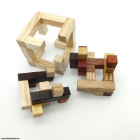 It's no secret that I love cube puzzles, and Andrey's "Repair the Cube" is an excellent one! Two internal pieces dance around the constraints of a truncated cage...the name asks you to position those pieces in such a way that they are contained within the cube and also repair the missing corner bits. With a level 11.10 solution, this is no easy task. onstruction of this puzzle was trickier than a 4x4 cube...this 5x5 has many more pieces and levels of interlock. Originally constructed using Wenge and White Oak. This unique version features an Ash cage with mixed wood internal pieces consisting of zebrawood, yellowheart, wenge, oak, ash, paduak, granadillo, purpleheart, and leopardwood.This puzzle is shipped assembled.