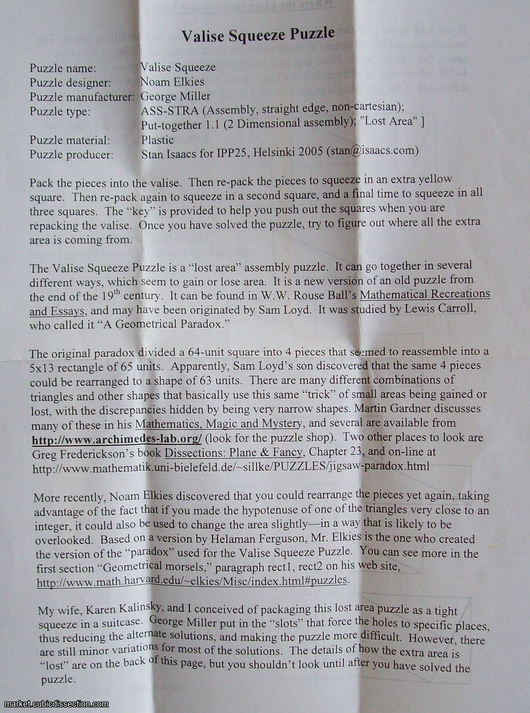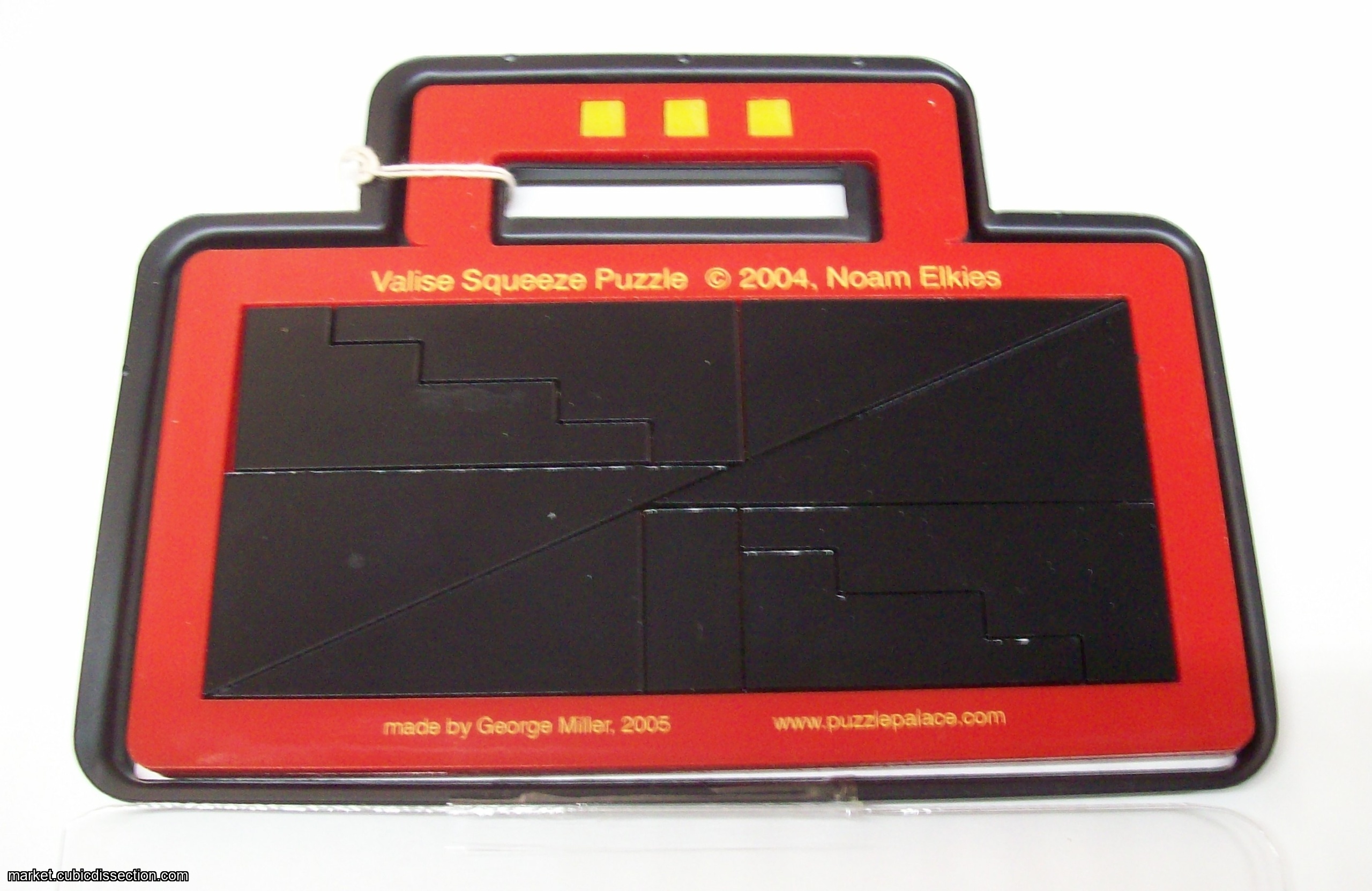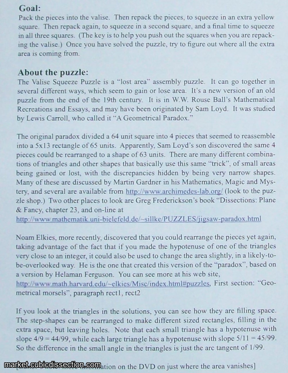 Pack the pieces into the valise. Then repack the pieces, to squeeze in an extra yellow square. Then repack again, to squeeze in a second square, and a final time to squeeze in all three squares. (The key is to help you push out the squares when you are repacking the valise.) Once you have solved the puzzle, try to figure out where all the extra area is coming from