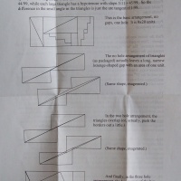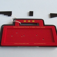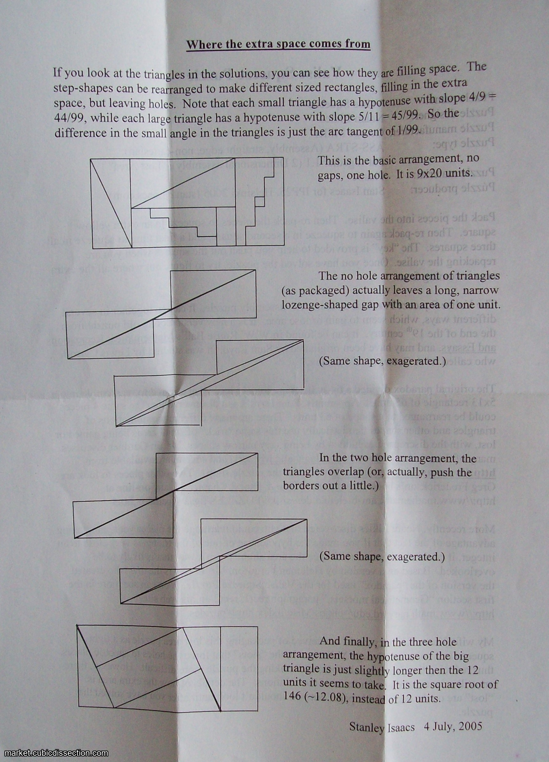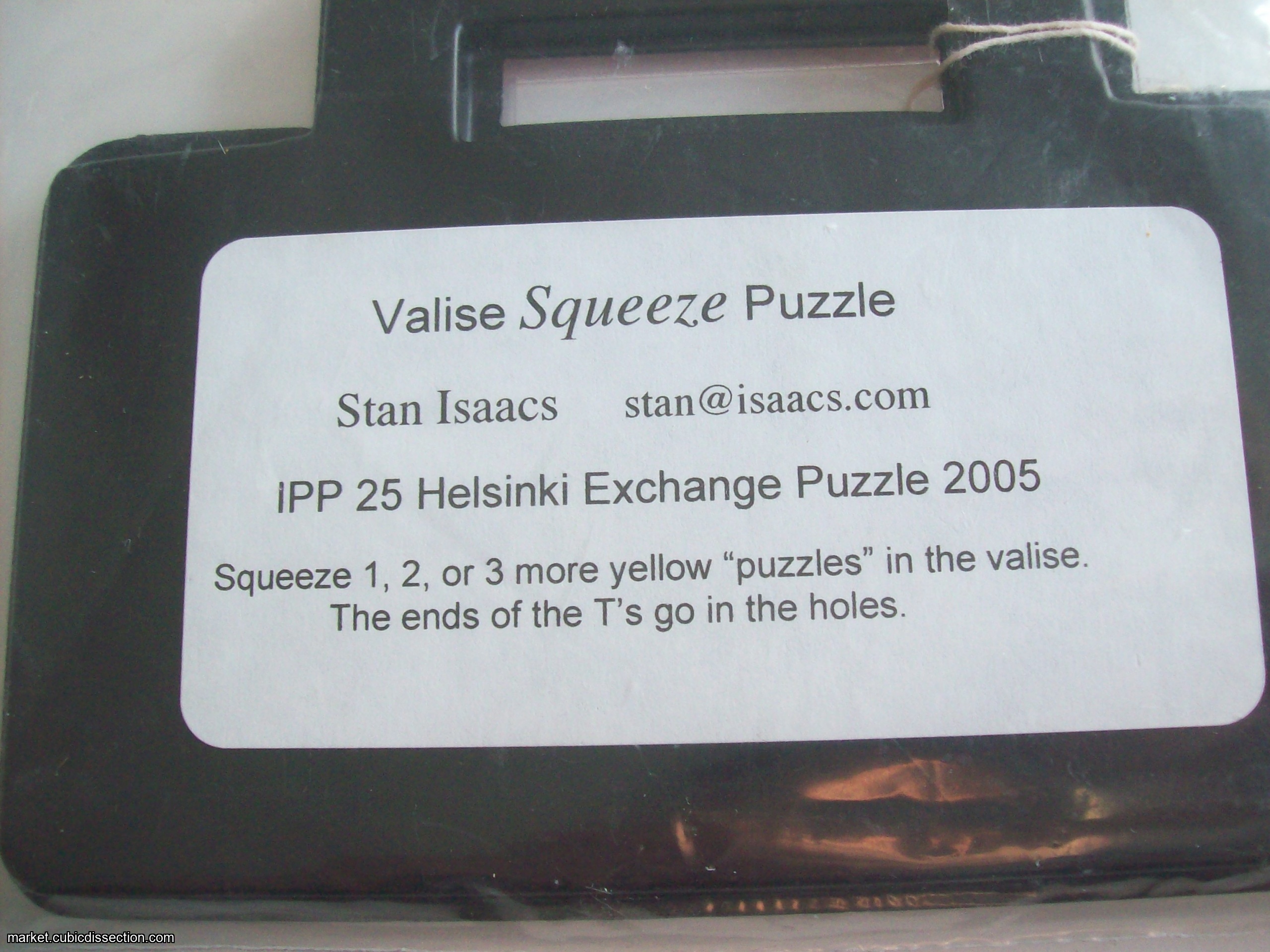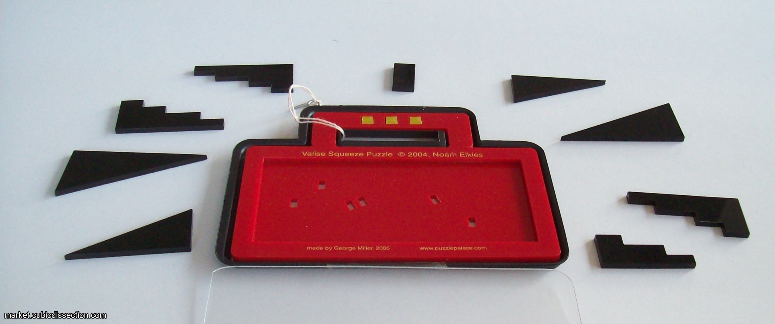 Pack the pieces into the valise. Then repack the pieces, to squeeze in an extra yellow square. Then repack again, to squeeze in a second square, and a final time to squeeze in all three squares. (The key is to help you push out the squares when you are repacking the valise.) Once you have solved the puzzle, try to figure out where all the extra area is coming from