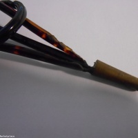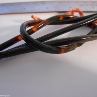 This is what I think was a Bakelite version of Loony Loop. A little research turned up a picture that looks like this one from a Chinese puzzle kit, on page 96 of Denk Spiele Der Welt, by Delft and Botermans. Unfortunately, it looks like the plastic has started to deteriorate on the end and in a spot on the middle. Most likely pre-1900, based on the other puzzles I procured from the same auction.