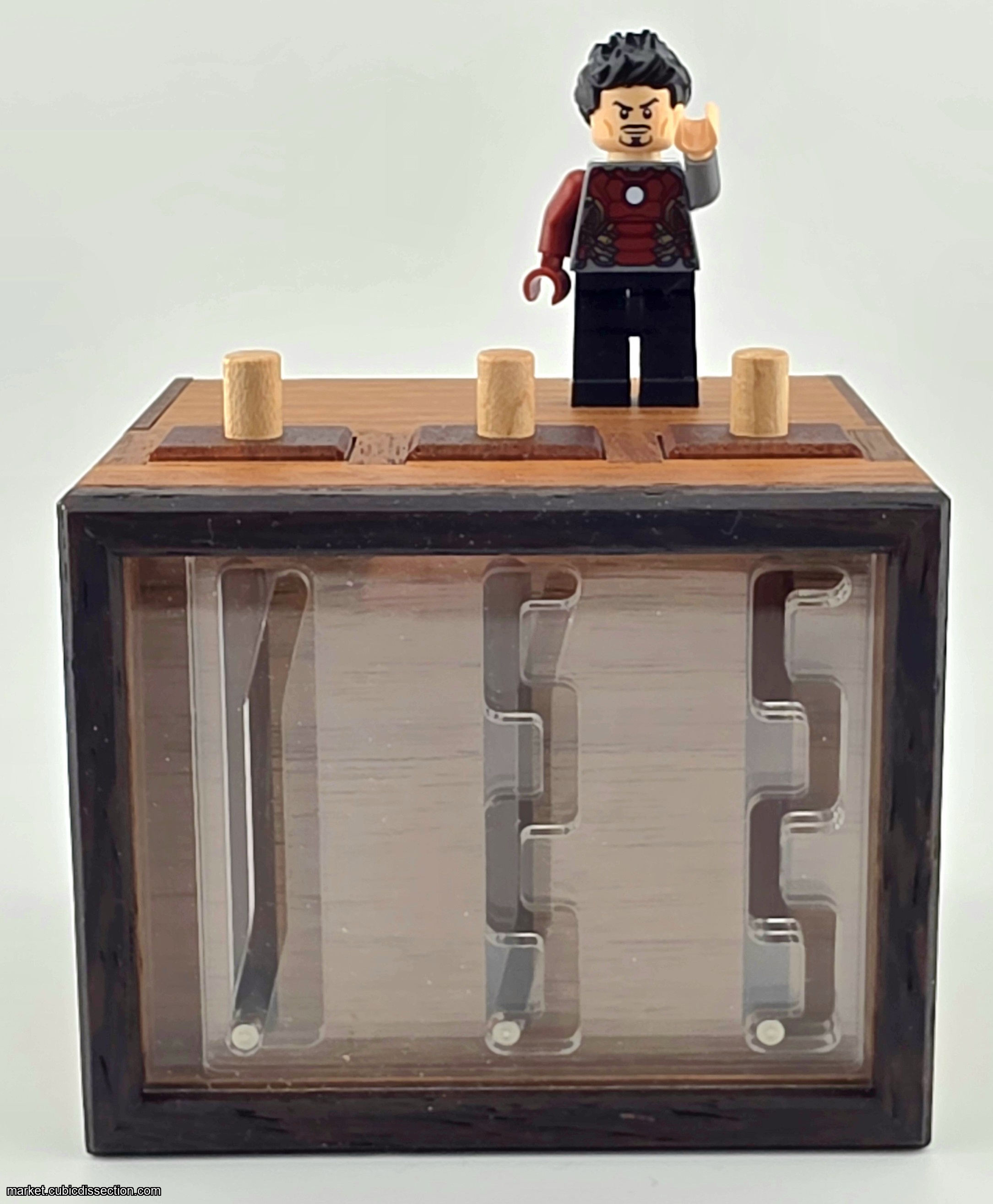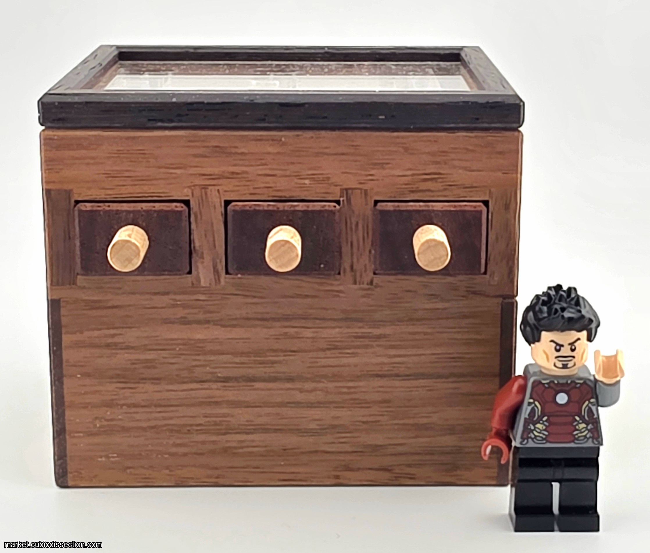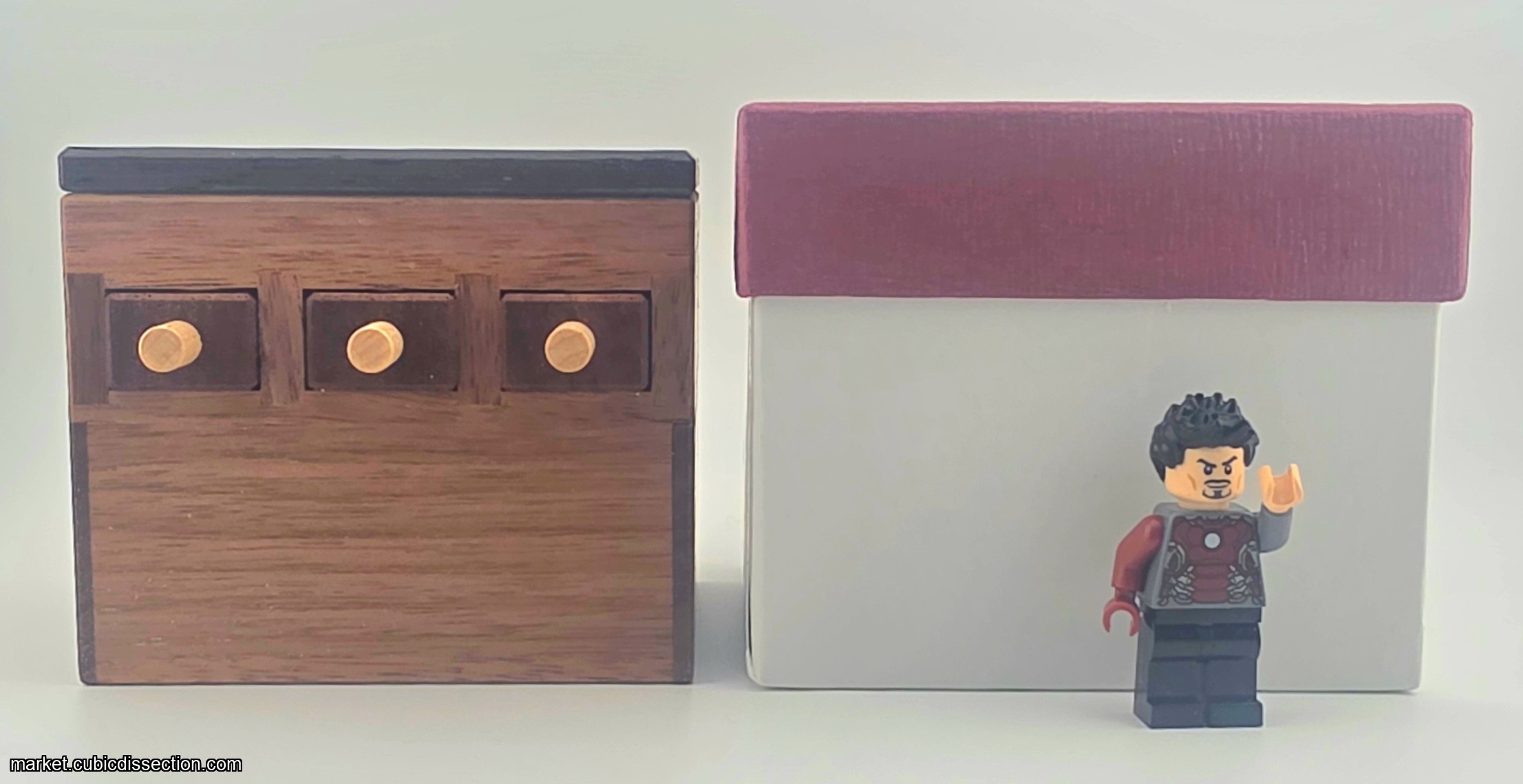 "This work was designed for Karakuri Puzzle Party in Hakone 2018.“Is it possible to make items of system such as Binary or Ternary with avery clear design?” I wondered about this so I decided to try and see if I could do it. There are only 3 “drawers”. It is the minimum number that we need to fully enjoy the system. There are only 2 devices. When you have solved the puzzle, you can finally open the bottom drawer. The mechanism used for RF-38 “Canon Chest” was used.This is a drawer of Quinary system. It takes 50 moves to open (except for opening the lid). When all the 3 “drawers” are opened, you can open the bottom drawer. The number of moves has increased in this work. As might be expected, it will take time to solve this item. The formula to calculate the number of moves is “5*5*2=50”. Well, how about the formulas of other items?"