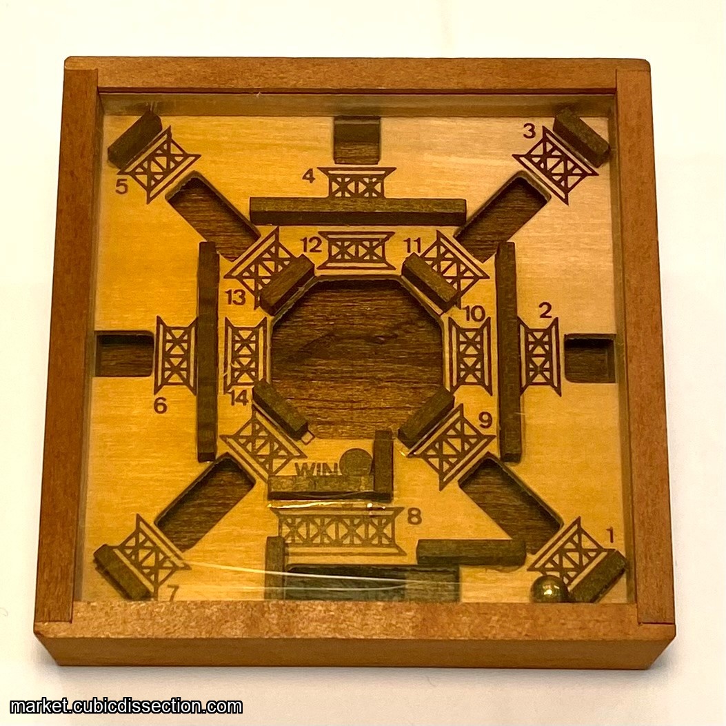 4" x 4" wood dexterity puzzle from WADA. Goal is to get the ball through the obstacles to the spot labeled WIN. Don't know the name of this one, but it is labeled a part of "The Game Book" set (G-500-III) in the Slocum collection at Indiana Univ. Puzzle is in good condition with minor edge wear on the wood. Acrylic shows some yellowing. No box.